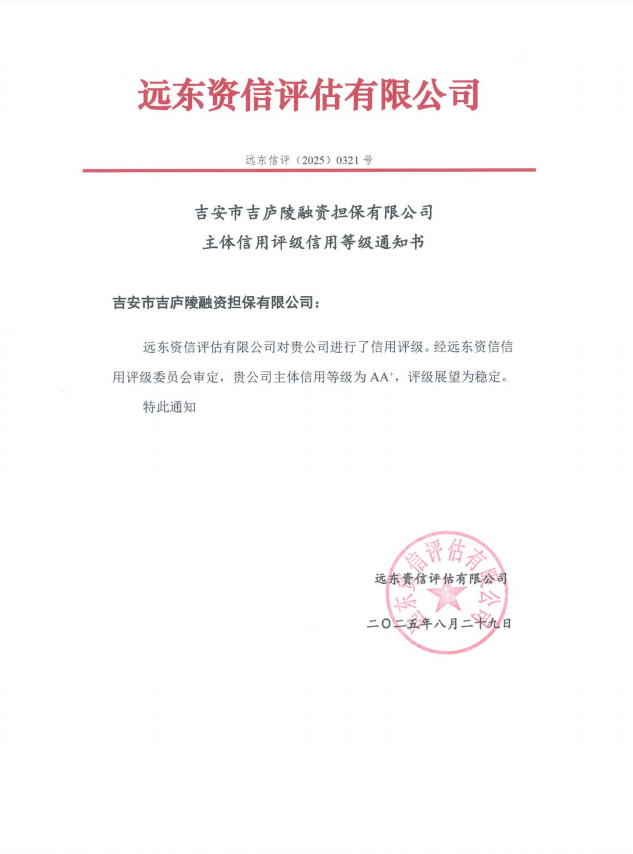 近日,经远东资信评估有限公司(中国第一家社会化专业资信评估机构,拥有境内市场全牌照信用评级资质)信用评级委员会审定,市吉庐陵担保公司成功续评AA⁺主体信用评级,评级展望为稳定(远东信评〔2025〕0321号)。该评级结果标志着公司信用资质获得资本市场权威认可,信用水平达到行业较高等级。